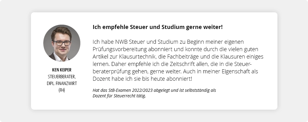 Die Autorinnen und Autoren von NWB Steuer und Studium lehren an renommierten Steuerfachschulen. Sie wissen genau, welches Wissen konkret von Ihnen verlangt wird.