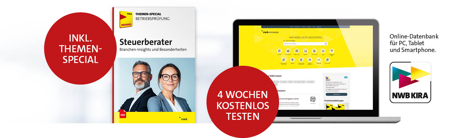 Testen Sie das digitale Themenpaket NWB Betriebsprüfung 4 Wochen kostenlos! Das Themen-Special „Steuerberater – Branchen-Insights und Besonderheiten“ erhalten Sie gratis dazu.