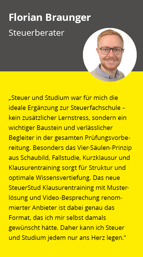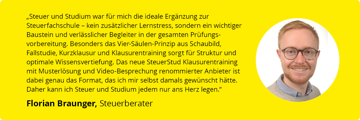 - NEU: Monatliches SteuerStud Klausurentraining mit Videobesprechung von 4 bekannten Steuerfachschulen