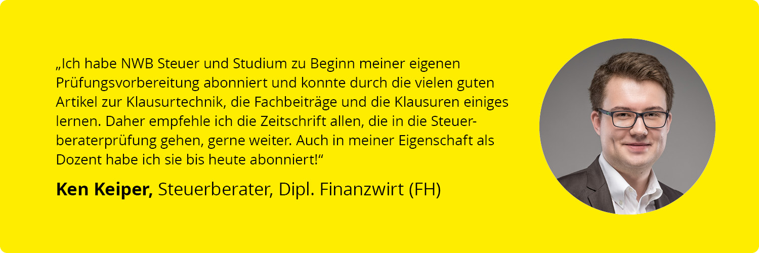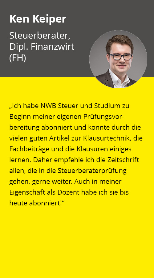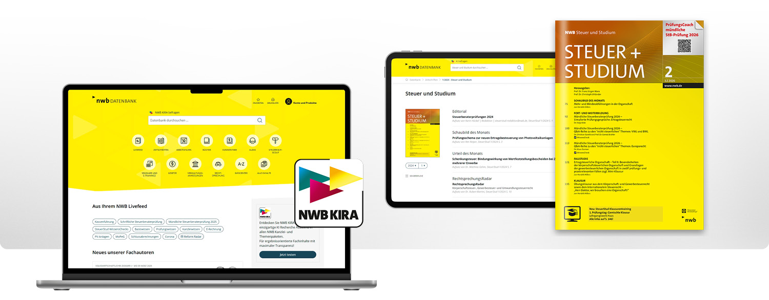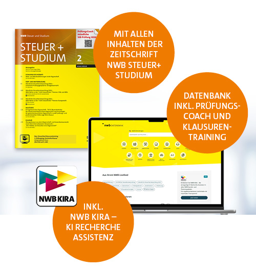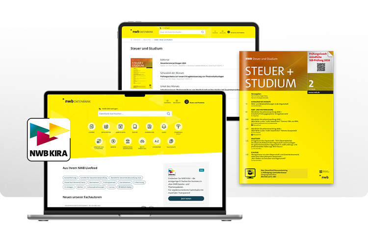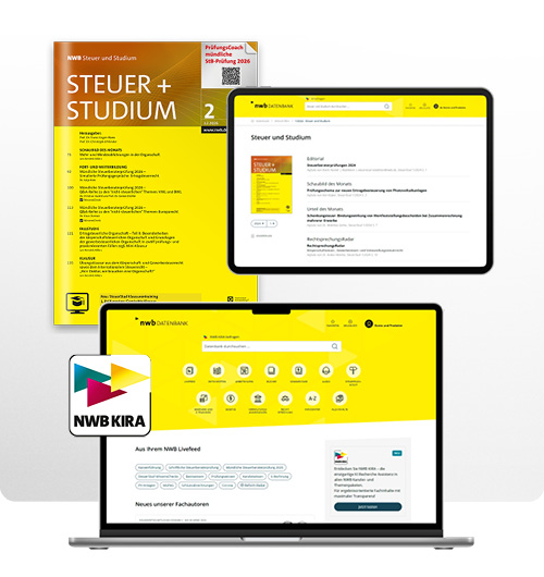 - Monatliche Ausgabe der Zeitschrift NWB Steuer und Studium – optional auch als gedrucktes Heft erhältlich. Inkl. Schwerpunkt-Ausgaben zur schriftlichen und mündlichen StB-Prüfung.