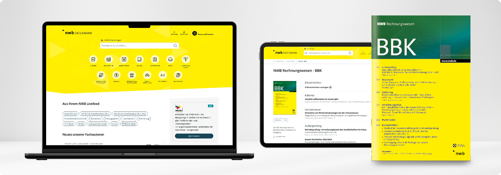 NWB Rechnungswesen unterstützt Unternehmen und Steuerkanzleien bei allen Aufgaben im Rechnungswesen. Nutzen Sie das Expertenwissen zu Buchführung und Umsatzsteuer, Bilanzierung nach Handels- und Steuerrecht sowie IFRS, Steuerrecht für Unternehmen, Kostenrechnung, Controlling und Betriebswirtschaft. Dank kontinuierlicher Updates bleibt die Datenbank immer auf dem aktuellen Stand von Rechtsprechung, Gesetzgebung und Verwaltung.